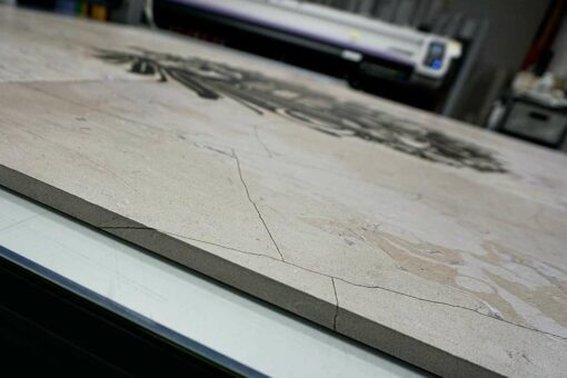 Fake-Steinplatten aus Hartschaumplatte schwarz, oder weiß in Stärke 3-5 mm (Standardprogramm, stärkere Platten auf Anfrage möglich), Vorderseite kaschiert mit bedruckter Klebefolie im Wunschdekor (verschiedene Steinmuster zur Auswahl, prinzipiell jeder Stein möglich), Beschriftung (mittels Klebeschablone) mit Acrylfarbe in Silber, Gold, Bronze, oder irgendeiner anderen Farbe.